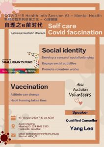 Self care COVID faccination Speaker: Yang Lee – Qualified Consellor Zoom Meeting: Meeting ID: 924 4868 6373 Passcode: aav2022 + Add to Google Calendar + iCal / Outlook export The event is finished. Date Feb 19 2022 Expired! Time 7:30 pm Share this event SearchSearchRecent PostsCommunity Empowerment in Action! Community Peace Forum Spreading Love and Support This Christmas Holiday Season! Sausage sizzle fundraiser at Bunnings Notting Hill Supporting Children in Rural China in this winter Recent CommentsArchives June 2025 April 2025 December 2024 November 2024 September 2024 May 2024 April 2024 March 2024 February 2024 December 2023 September 2023 July 2023 June 2023 March 2023 February 2023 January 2023 December 2022 October 2022 September 2022 July 2022 June 2022 October 2021 September 2021 August 2021 July 2021 June 2021 April 2021 March 2021 February 2021 October 2020 Categories Awards Community Awards Education Support Environment Protection New Migrants News Projects Recognition Services Social Support Upcoming Events